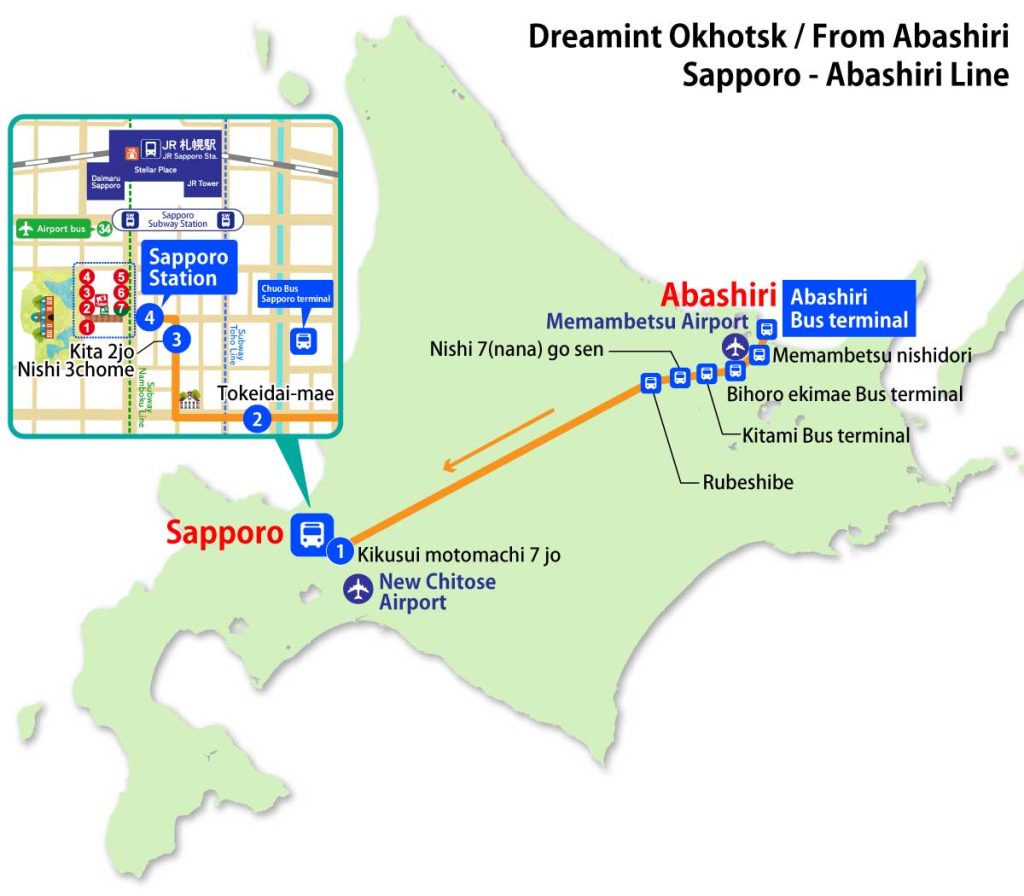 [Boarding] Abashiri Bus Terminal → Memambetsu nishidori→ Bihoro ekimae Bus terminal →Tobu higashi-guchi →Kogyo daigaku-iriguchi→ Kitami Bus Terminal → Nishi 7(nana) go sen → Rubeshibe → [Get off] ❶Kikusui Motomachi 7-jo → ❷Tokeidai-mae → ❸Kita 2-jo Nishi 3-chome ❹Sapporo Station