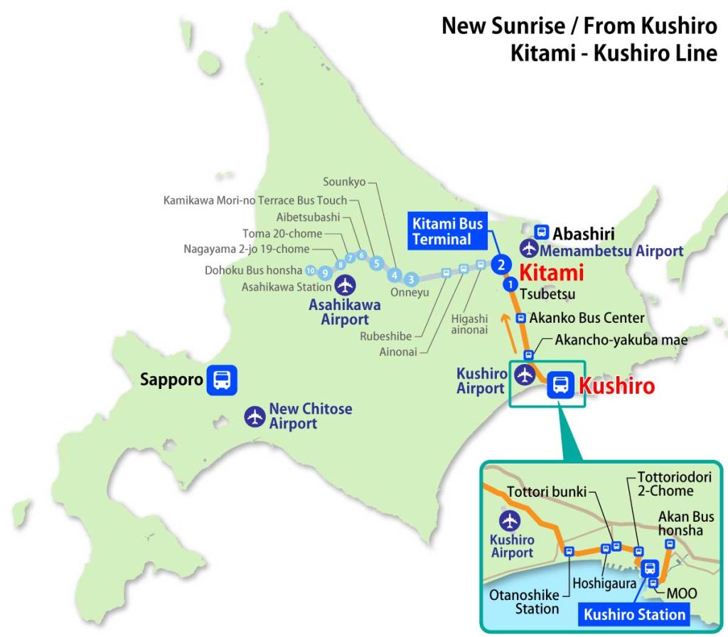 ❸[Kitami ⇔ Kushiro] Dohoku Bus, Kitami Bus, Akan Bus: NEW Sunrise