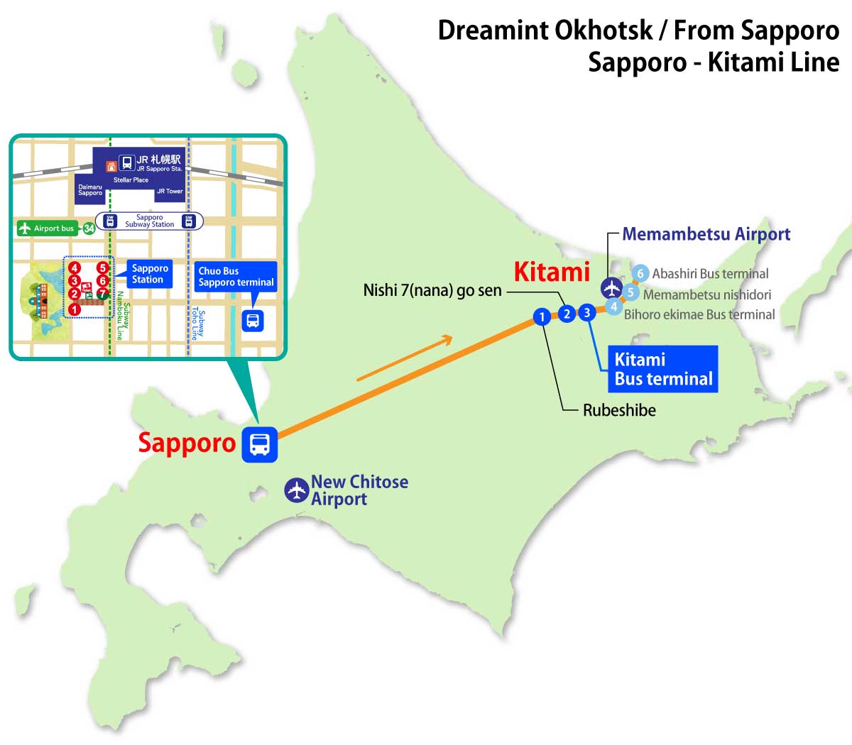 [Boarding] Sapporo Station③→ Chuo Bus Sapporo Terminal → [Get off] ❶Rubeshibe→❷ Nishi 7(nana) go sen→❸ Kitami Bus Terminal→❹ Kogyo daigaku-iriguchi→❺Tobu higashi-guchi →❻ Bihoro ekimae Bus terminal →❼Memambetsu nishidori →❽ Abashiri Bus Terminal