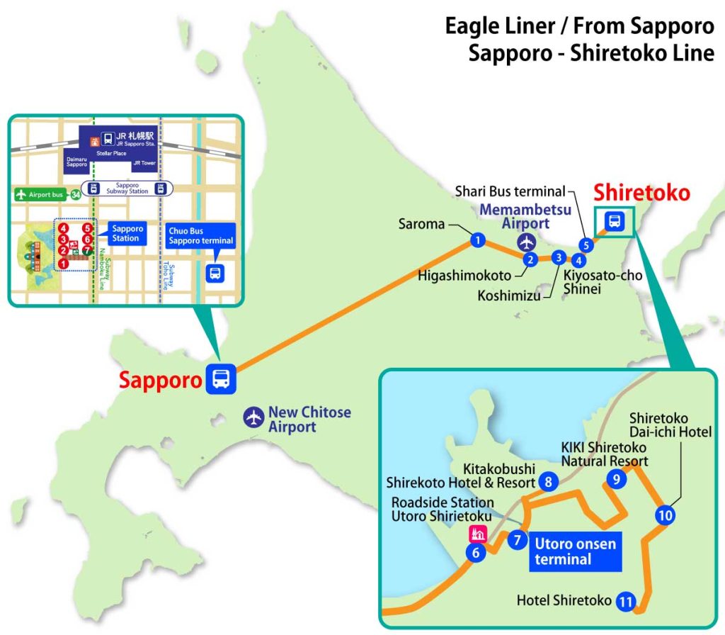 [Boarding] Chuo Bus Sapporo Terminal→ [Get off] ❶Saroma- cho Wakasa → ❷Higashimokoto→ ❸Koshimizu→ ❹Kiyosato-cho Shinei→ ❺Shari Bus Terminal→ ❻Roadside Station Utoro Shirietoku→ ❼Utoro onsen terminal→ ❽Kitakobushi Shirekoto Hotel & Resort →❾KIKI Shiretoko Natural Resort → ❿Shiretoko Dai-ichi Hotel → ⓫Hotel Shiretoko