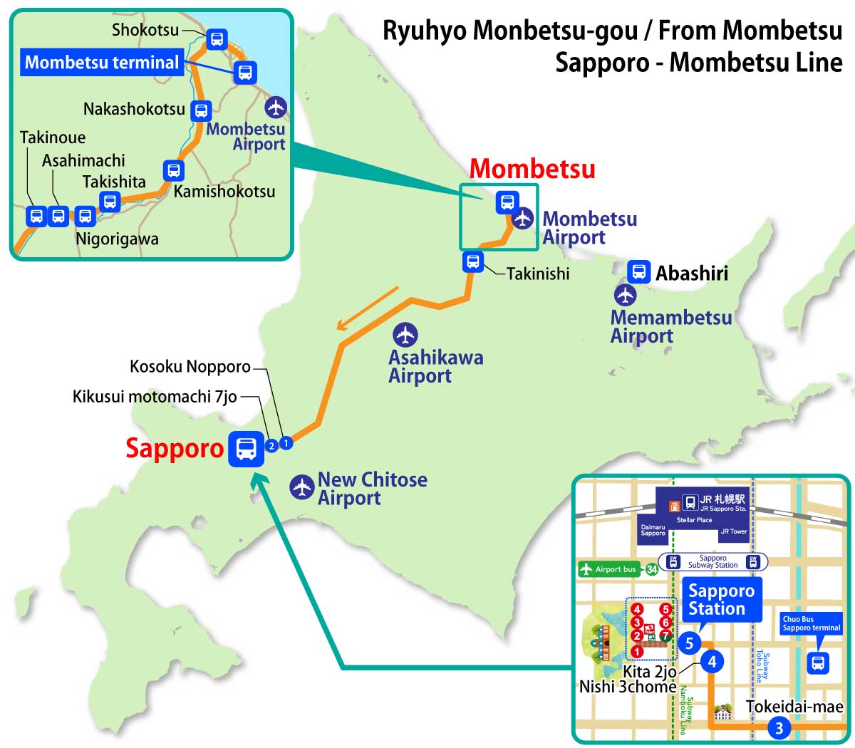From Mombetsu : Daytime / Mombetsu Terminal (7:00, 15:30) → Sapporo Station (11:20, 19:50)