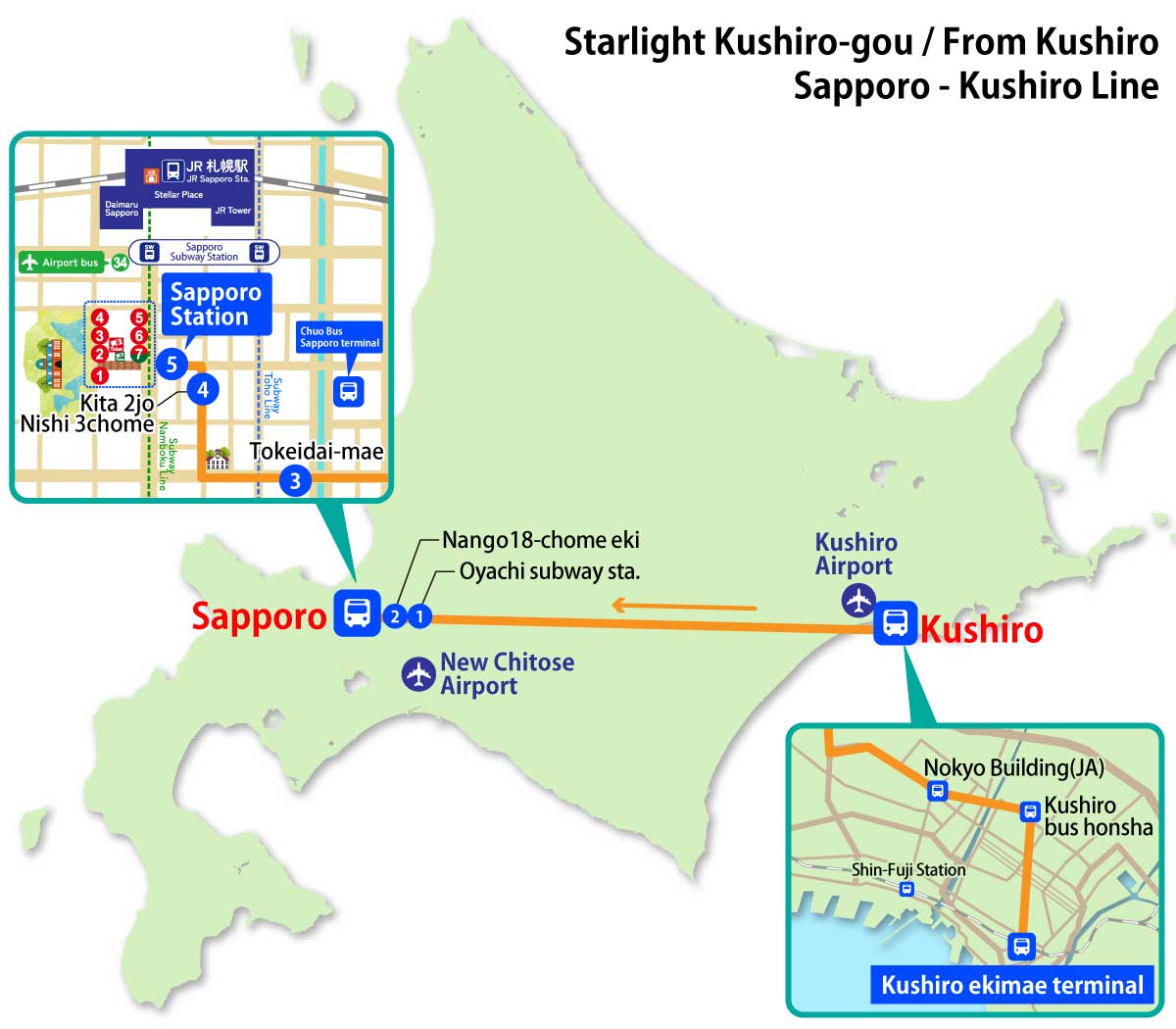 [Boarding] ❶Sapporo Station → Chuo Bus Sapporo terminal → Oyachi subway sta. →  [Get off]  ❶Nokyo Building(JA) → ❷Kushiro bus honsha → ❸Kushiro ekimae terminal