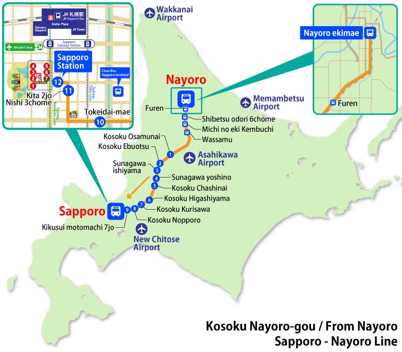 [Boarding] Nayoro ekimae → Furen → Shibetsu odori 6chome → Michi no Eki Kenbuchi → Wassamu → [Get off] ❶Kosoku Osamunai → ❷Kosoku Ebetsu → ❸Kosoku Sunagawa Ishiyama → ❹Kosoku Sunakawa yoshino → ❺Kosoku Chashinai → ❻Kosoku Higashiyama → ❼Kosoku Kurisawa → ❽Kosoku Nopporo → ❾Kikusui Motomachi 7jo → ❿Tokeidial-mae → ⓫Kita 2-jo Nishi 3-chome → ⓬Sapporo Sta.