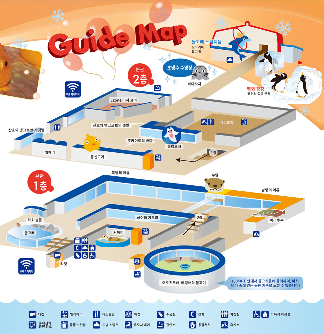 대소 70여 개 있는 수조에는 차가운 바다에서 사는 물고기와 따뜻한 바다에 사는 물고기를 중심으로 250 종류 5,000 마리나 되는 생물을 전시하고 있습니다.