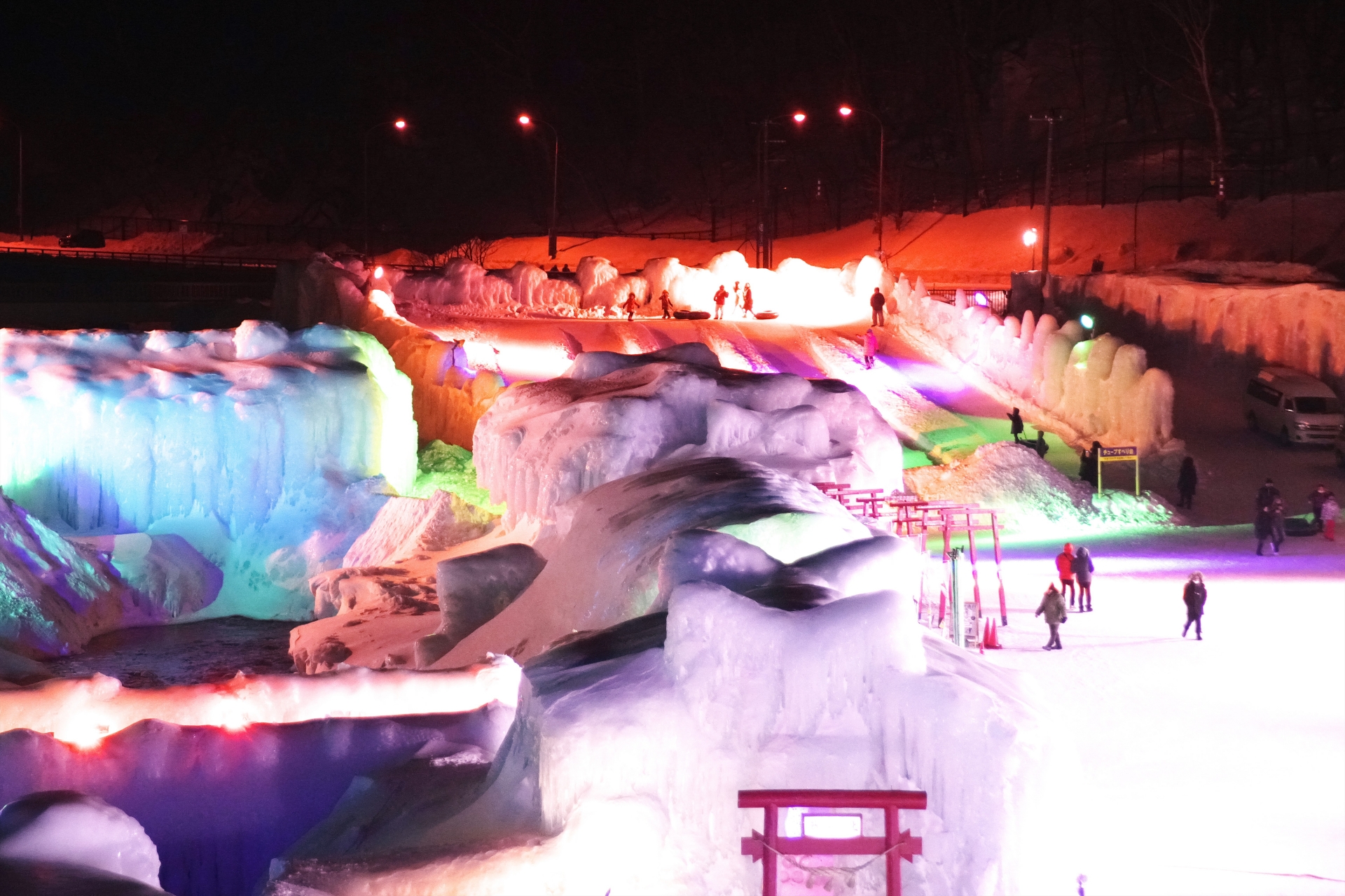 Three months in the making. The ice sculptures were created by working in sub-zero temperatures and freezing multiple layers of ice. The seven colored lights create a fantastic world. On weekends, fireworks are also set off, making it one of the most popular winter festivals in Hokkaido.